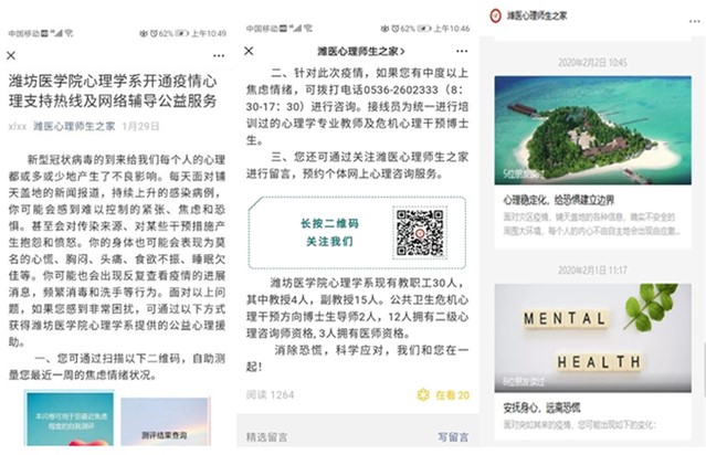 新冠肺炎疫情暴发后,针对人们难以控制的紧张、焦虑和恐惧情绪,自1月29日起,在心理学系党总支的统筹安排下,应用心理学党支部书记王艳郁教授带领全体党员迅速投入到潍医心理支持热线及“潍医心理师生之家”网络辅导公益服务中,为民众提供心理支持,最大程度降低疫情造成的心理伤害。同时,根据疫情期间公众出现的典型心理状态变化,带领广大教师和博士、硕士生党员针对性地撰写心理科普文稿40余篇,开展心理健康知识普及教育,通过互动问答的形式为师生及社会大众解疑答惑。目前,共有1200余人阅读了相关知识,220余人接受了不同程度的心理援助服务。潍医心理支持热线及“潍医心理师生之家”网络平台除服务师生员工、社会大众外,还被潍坊市奎文区团委、昌邑市团委、高新区工会、潍坊市消防支队等作为本系统内专用心理援助平台。
