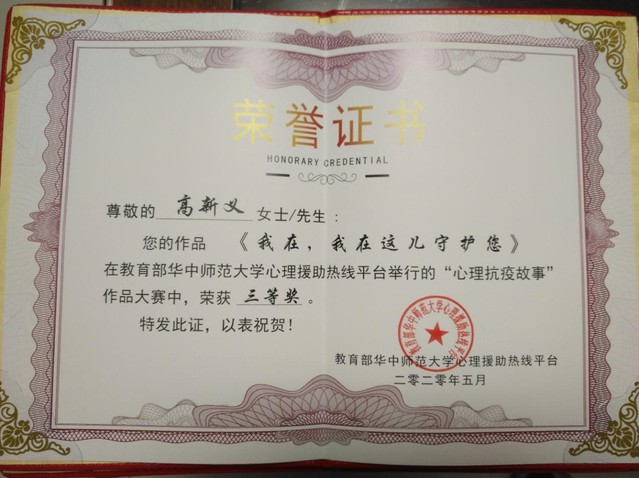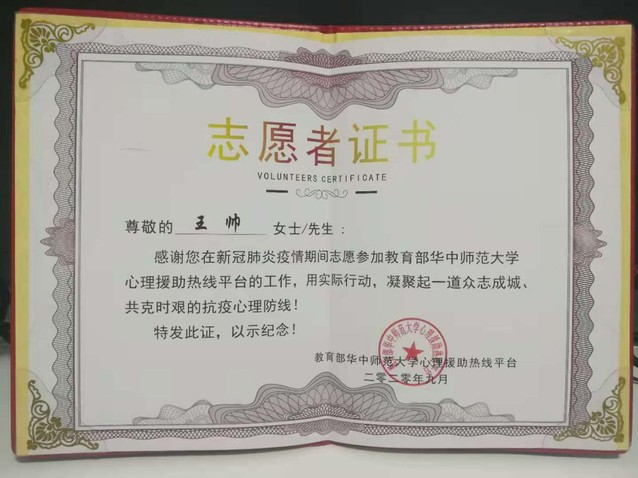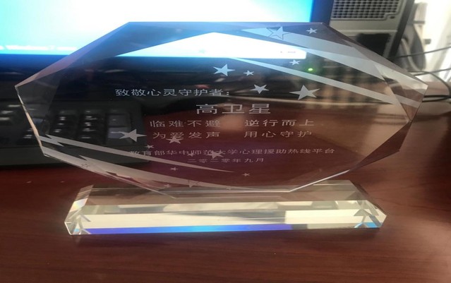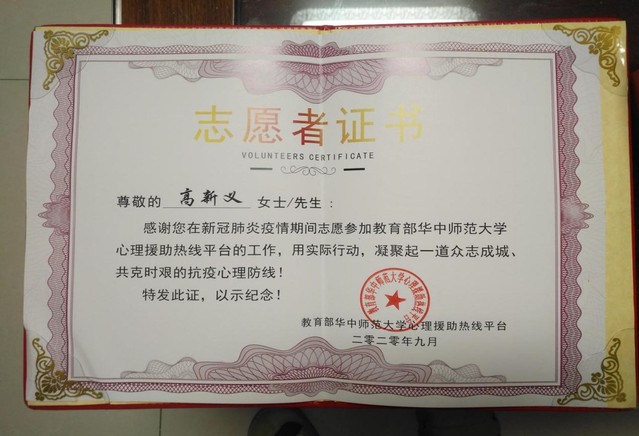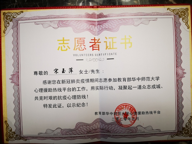 近日,教育部华中师范大学心理援助热线平台颁发了志愿者证书及“临难不避、逆行而上、为爱发声、用心守护”荣誉奖杯。卡提诺论坛 的宋玉萍教授、孙琳副教授、高新义、高卫星、王帅5位教师均获得此殊荣。